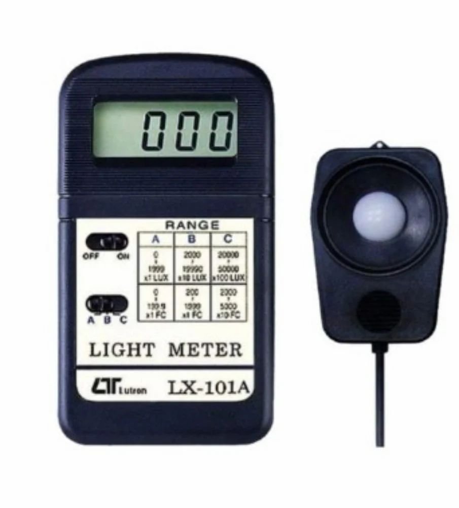 LIGHT METER Model : LX-101A• 3 ranges : 2,000 Lux, 20,000 Lux, 50,000 Lux.• Spectrum meet C.I.E. photopic spectrum.• Sensor with 2 filters, professional quality.• Separate probe, Size : 131 x 70 x 25 mm
